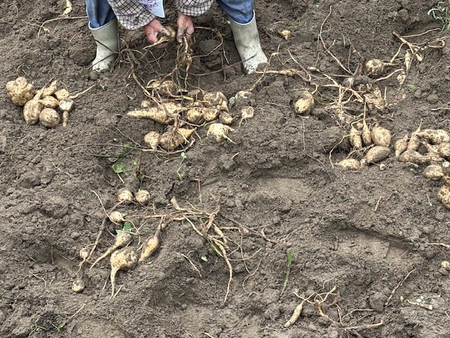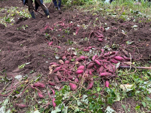 今年のさつまいもの出来は猛暑などの影響で心配されましたが、まあまあの収穫でした。この後、さつまいもを千切りにして天日と寒風にさらして乾燥させコッパを作ります。これがこっぱん餅(餅米とこのコッパを茹でたものを混ぜてつくる餅)の原料となります。